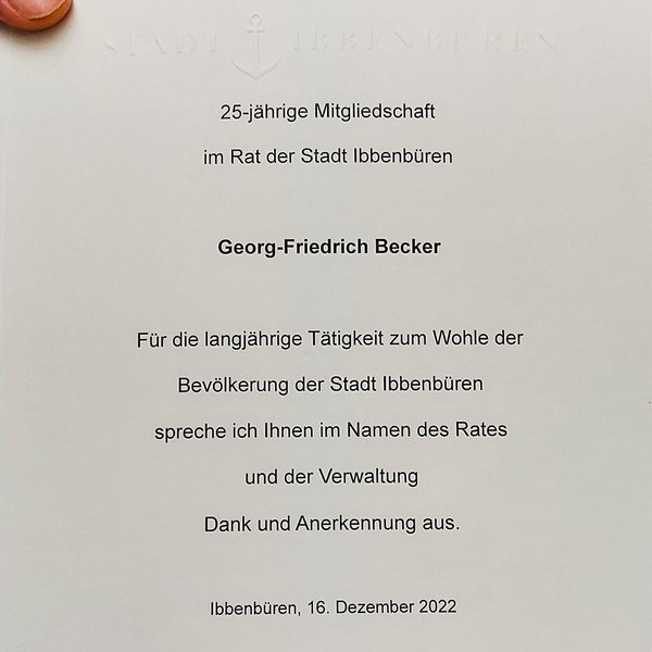 Dieses Jahr möchten wir unser Augenmerk zum Ausklang des Jahres Georg-Friedrich „Fritz“ Becker widmen, der vor kurzem zu seinem 25. Jahrestag als Mitglied im Rat unserer wundervollen Stadt geehrt wurde.
